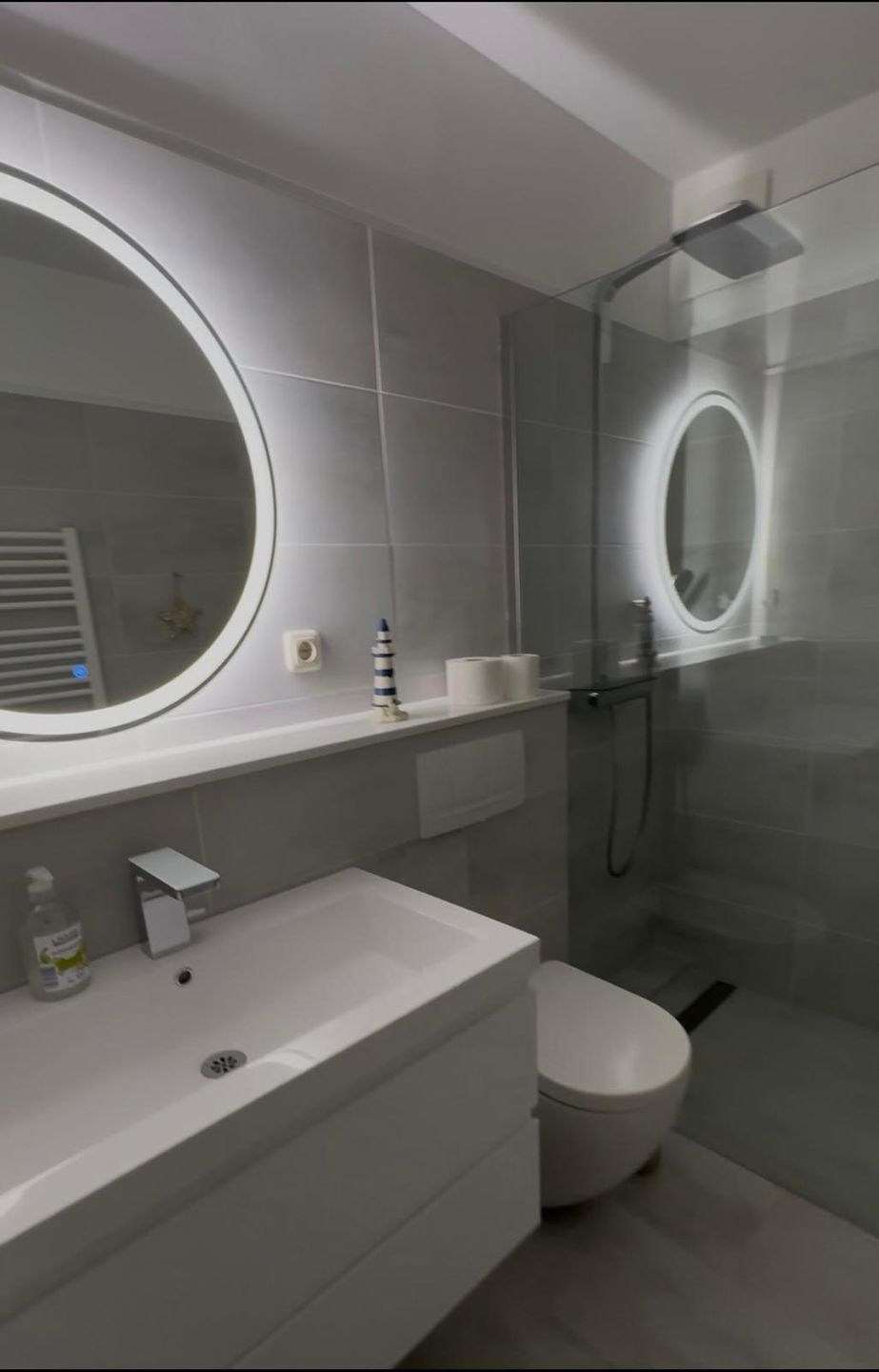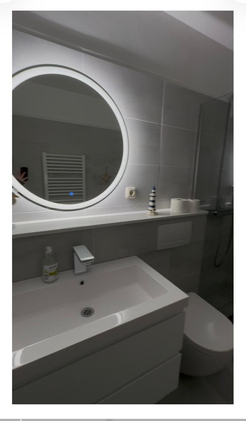 Das Schlafzimmer sowie das Wohnzimmer sind mit pflegeleichtem Laminatboden ausgestattet, was für ein angenehmes Wohnklima sorgt. Insgesamt bietet die Unterkunft Schlafmöglichkeiten für vier Personen aufgeteilt auf ein separates Schlafzimmer und weitere Schlafgelegenheiten im Wohnraum. Das moderne Badezimmer verfügt sowohl über eine Dusche mit Wanne als auch über eine Badewanne, WC und Waschbecken – ergänzt durch einen Spiegel und nützliche Ablagemöglichkeiten.