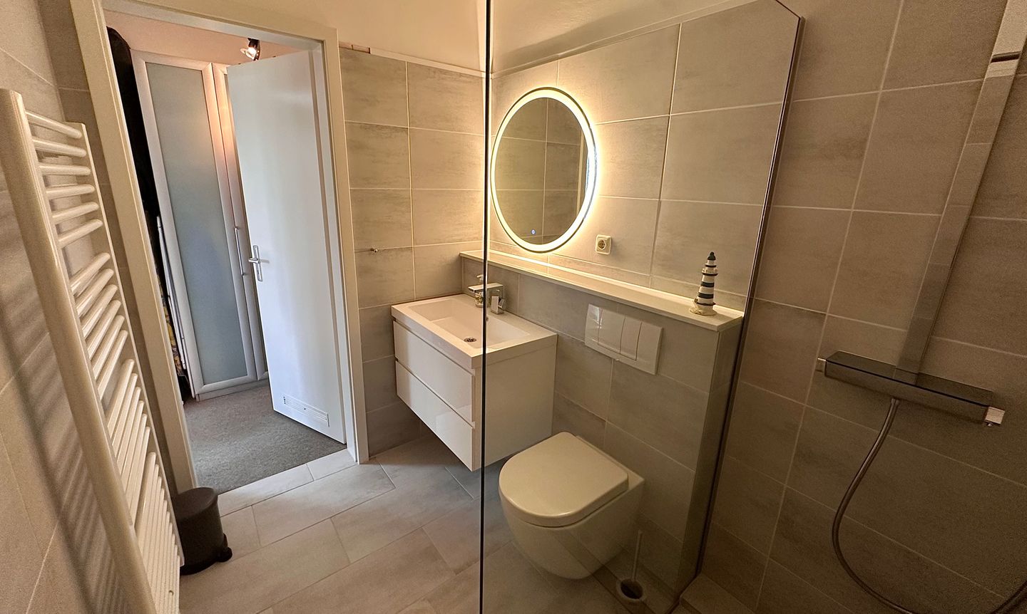 Das Schlafzimmer sowie das Wohnzimmer sind mit pflegeleichtem Laminatboden ausgestattet, was für ein angenehmes Wohnklima sorgt. Insgesamt bietet die Unterkunft Schlafmöglichkeiten für vier Personen aufgeteilt auf ein separates Schlafzimmer und weitere Schlafgelegenheiten im Wohnraum. Das moderne Badezimmer verfügt sowohl über eine Dusche mit Wanne als auch über eine Badewanne, WC und Waschbecken – ergänzt durch einen Spiegel und nützliche Ablagemöglichkeiten.