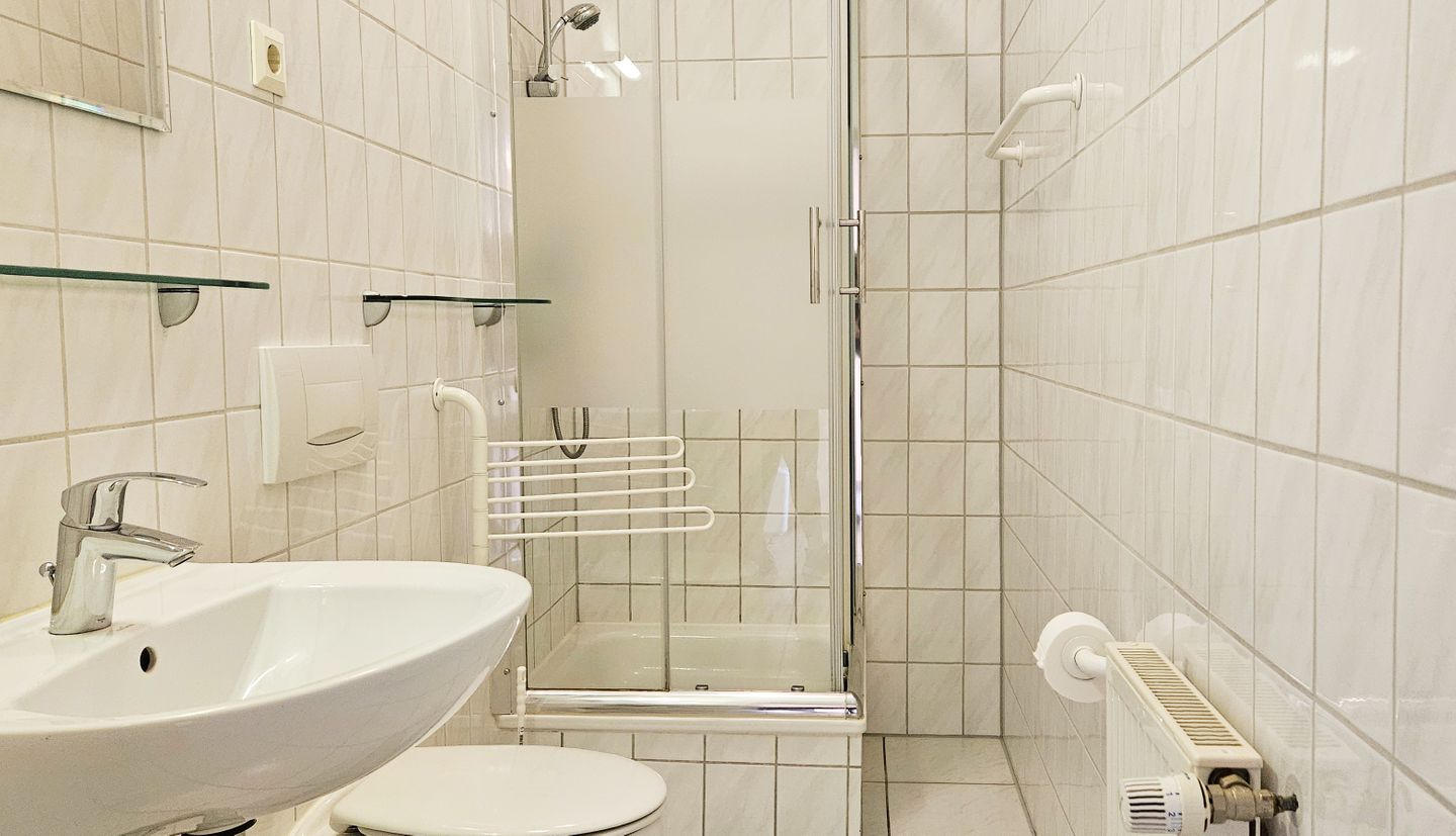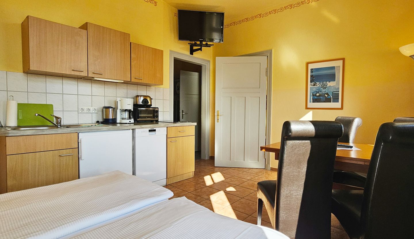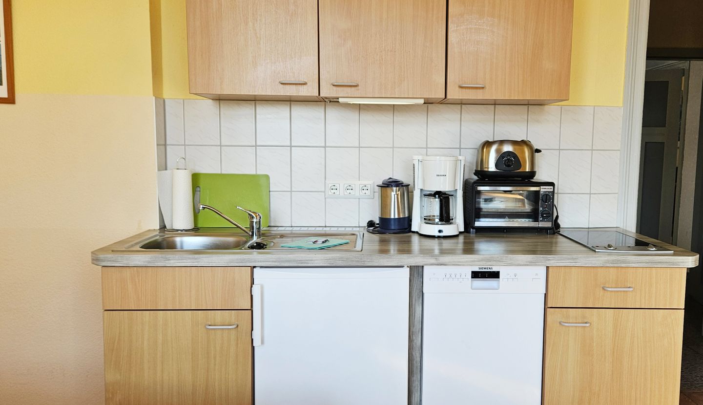 Die Kochnische ist auf die Selbstversorgung ausgerichtet und bietet Cerankochfeld, Backofen, Kühlschrank mit Gefrierfach, Spülmaschine, Kaffeemaschine, Wasserkocher, Toaster sowie Küchenutensilien, Geschirr, Besteck und Geschirrhandtücher. Das Badezimmer ist mit Waschbecken, WC, Spiegel und einer Dusche mit Wanne ausgestattet. Zusätzlich stehen unter anderem Garderobe, Staubsauger, Abfalleimer und warmes Wasser zur Verfügung.