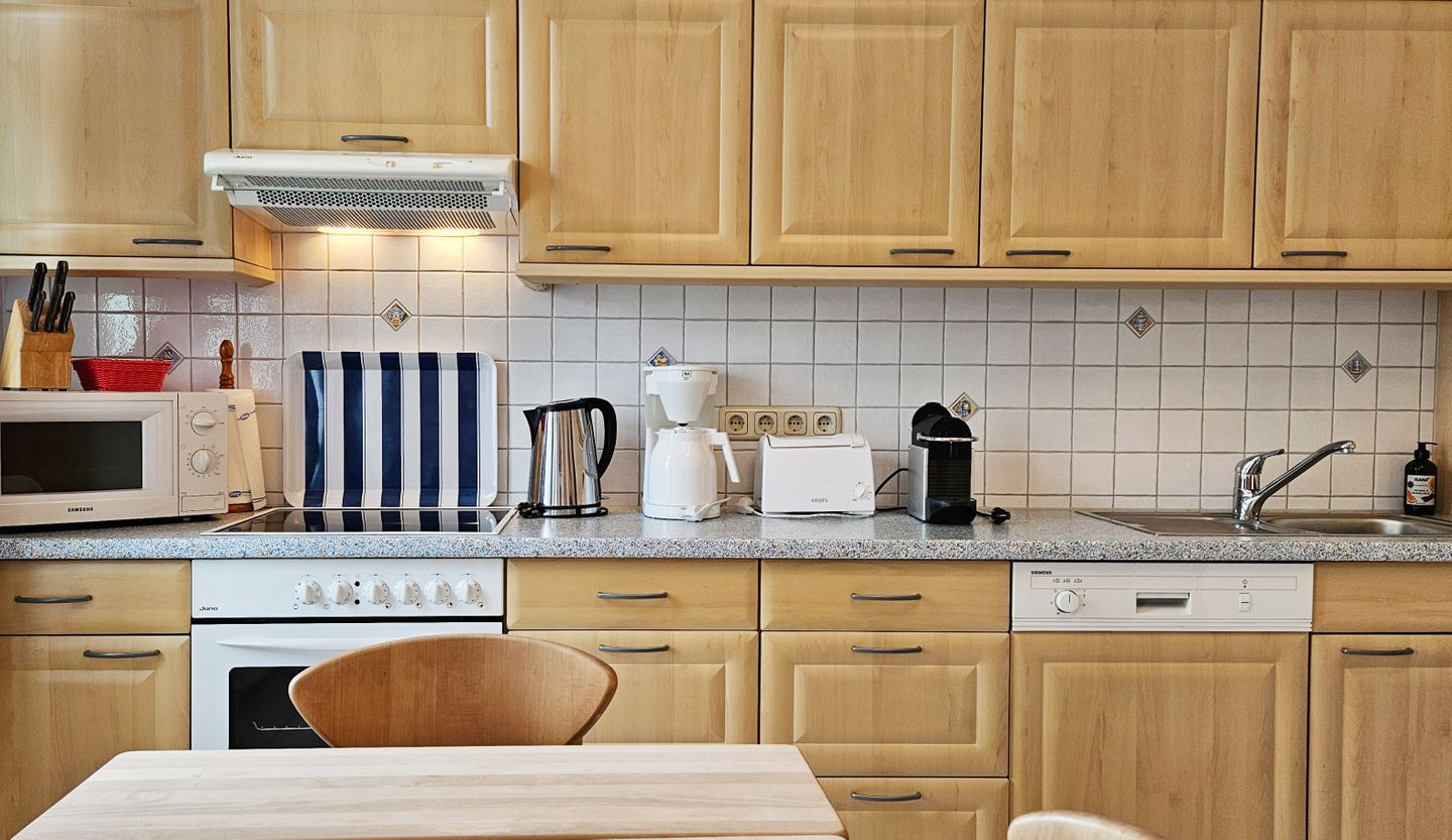 Im Inneren erwartet Sie eine geschlossene Küche, ausgestattet mit Backofen, Ceranherd, Mikrowelle, Kühlschrank, einem zusätzlichen Gefrierfach bzw. -schrank sowie einer Spülmaschine. Für den Alltag stehen außerdem Kaffeemaschine, Toaster, Wasserkocher und umfangreiche Küchenutensilien sowie Geschirr und Besteck zur Verfügung. Die Küche ist damit auf selbstständiges Kochen ausgelegt und bietet auch für längere Aufenthalte gute Voraussetzungen. Im Wohnbereich sorgen ein TV (44–55 Zoll) mit Kabelanschluss, Radio, WLAN sowie DVD- und CD-Spieler für Unterhaltung. Zusätzlich finden Sie einen Staubsauger und eine Garderobe im Haus.