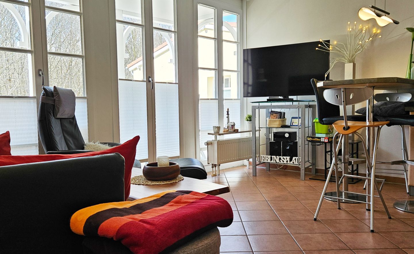 Der Wohnbereich ist mit Fliesen ausgestattet und angenehm praktisch eingerichtet: Sofaecke mit Sofa und Sessel, TV (insgesamt 2 Geräte, 25–34 Zoll, Satellitenanschluss) sowie eine HiFi-Anlage, CD- und DVD-Spieler und Radio sorgen für Unterhaltung. Internet und WLAN stehen Ihnen ebenfalls zur Verfügung. Für Ordnung und Komfort sind unter anderem Garderobe, Kommode, Ganzkörperspiegel, Staubsauger und Wäscheständer vorhanden; alle Fenster verfügen über Sichtschutz.