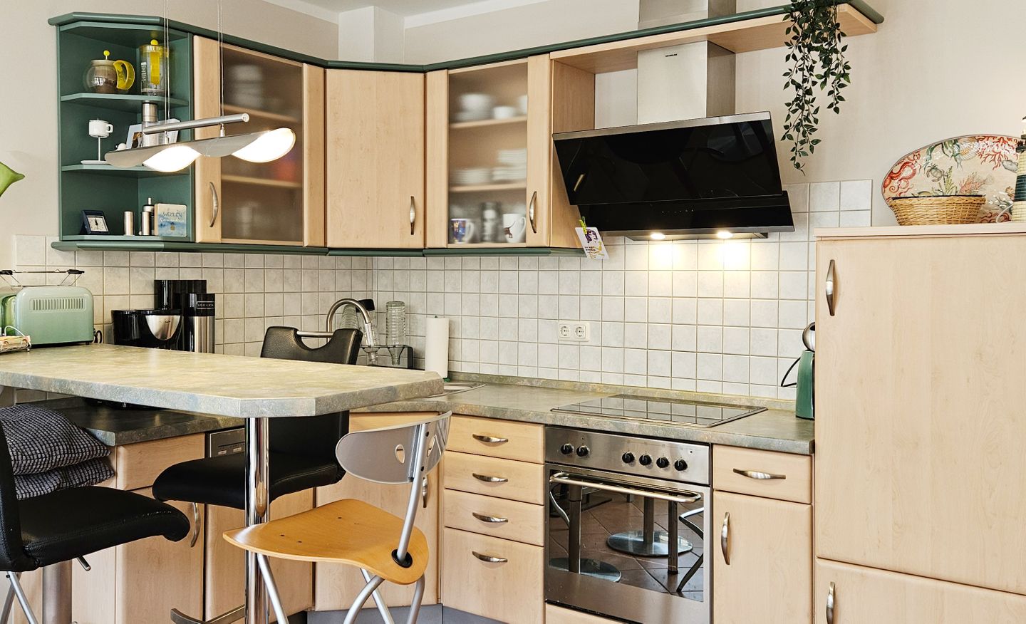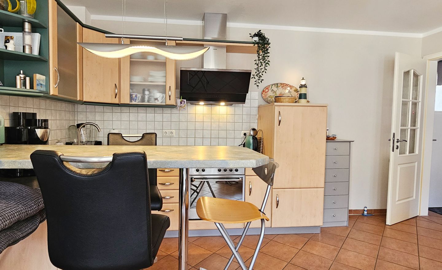 Die offene Küche ist direkt zum Wohnzimmer hin gestaltet und umfassend ausgestattet, damit Sie Ihre Mahlzeiten bequem selbst zubereiten können. Zur Verfügung stehen Cerankochfeld, Backofen (elektrisch), Mikrowelle, Kühlschrank mit Gefrierfach, Spülmaschine, Kaffeemaschine, Wasserkocher und Toaster sowie Küchenutensilien, Geschirr und Besteck und Geschirrhandtücher. Ein Essbereich ergänzt das Raumkonzept und macht gemeinsame Mahlzeiten unkompliziert.