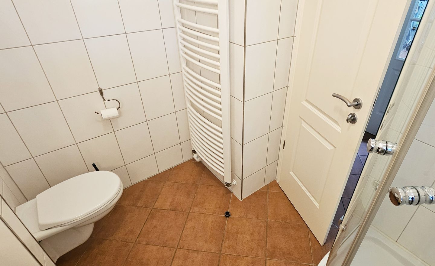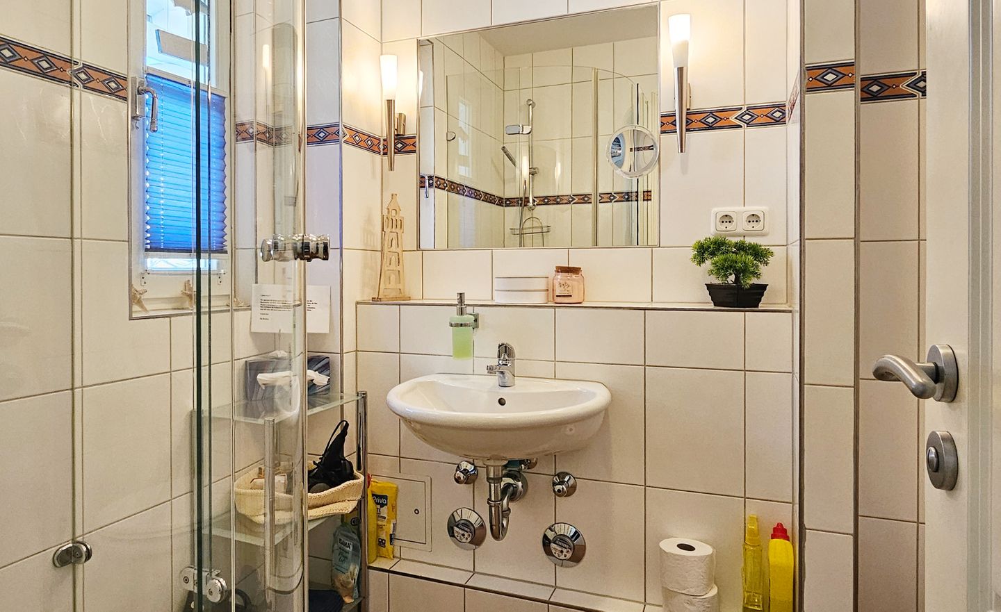 Im separaten Schlafzimmer – ebenfalls mit Fliesenboden – finden Sie einen angenehmen Ort zum Ausruhen. Das Badezimmer verfügt über Tageslicht (Fenster), WC, Waschbecken, Spiegel und Kosmetikspiegel sowie eine Dusche. Warmes Wasser und ein Haartrockner sind vorhanden. Für längere Aufenthalte ist die Ausstattung mit Waschmaschine (zur Eigennutzung) und Trockner besonders praktisch. Beheizt wird die Wohnung über eine Zentralheizung.