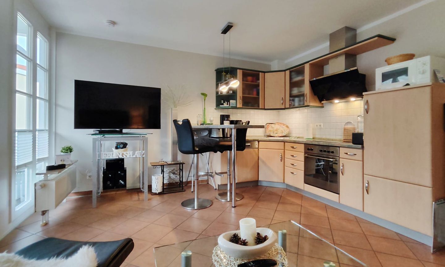 Die offene Küche ist direkt zum Wohnzimmer hin gestaltet und umfassend ausgestattet, damit Sie Ihre Mahlzeiten bequem selbst zubereiten können. Zur Verfügung stehen Cerankochfeld, Backofen (elektrisch), Mikrowelle, Kühlschrank mit Gefrierfach, Spülmaschine, Kaffeemaschine, Wasserkocher und Toaster sowie Küchenutensilien, Geschirr und Besteck und Geschirrhandtücher. Ein Essbereich ergänzt das Raumkonzept und macht gemeinsame Mahlzeiten unkompliziert.