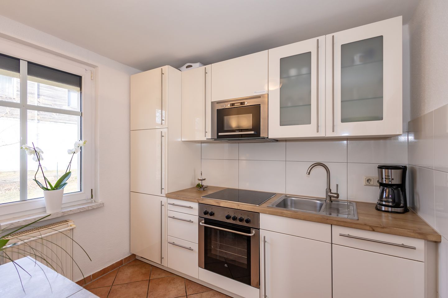 Die abgeschlossene Küche ist mit allem ausgestattet, was den Aufenthalt angenehm und flexibel macht: Neben einem Esstisch, einer Mikrowelle, einem Ceranherd, Backofen (Elektroanschluss), Kühlschrank mit Gefrierfach, Spülmaschine und diversen Küchenutensilien stehen auch Wasserkocher, Eierkocher und Toaster bereit. Für Kaffeeliebhaber sorgt eine Kaffeemaschine für einen guten Start in den Tag. Geschirr, Besteck und Geschirrhandtücher sind vorhanden. Im Abfalleimer können Küchenabfälle problemlos entsorgt werden.